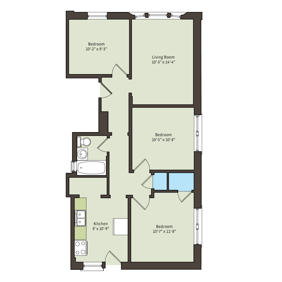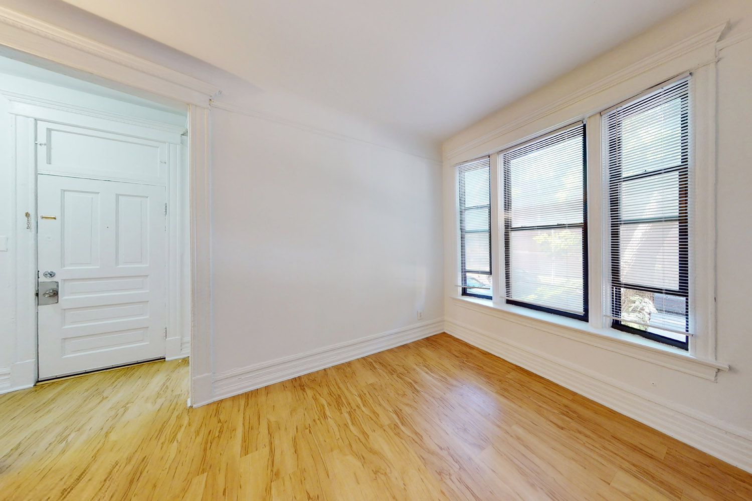 The projected corner bay windows of this delicate yellow brick facade offer abundant light and ample cross-ventilation to the interiors as well as unobstructed views of the streetscape. A solid limestone base combines with a grand Romanesque entryway, both anchoring the building and marking its presence in the center of the neighborhood just a few minutes from Lake Michigan to the east and Washington Park to the west.