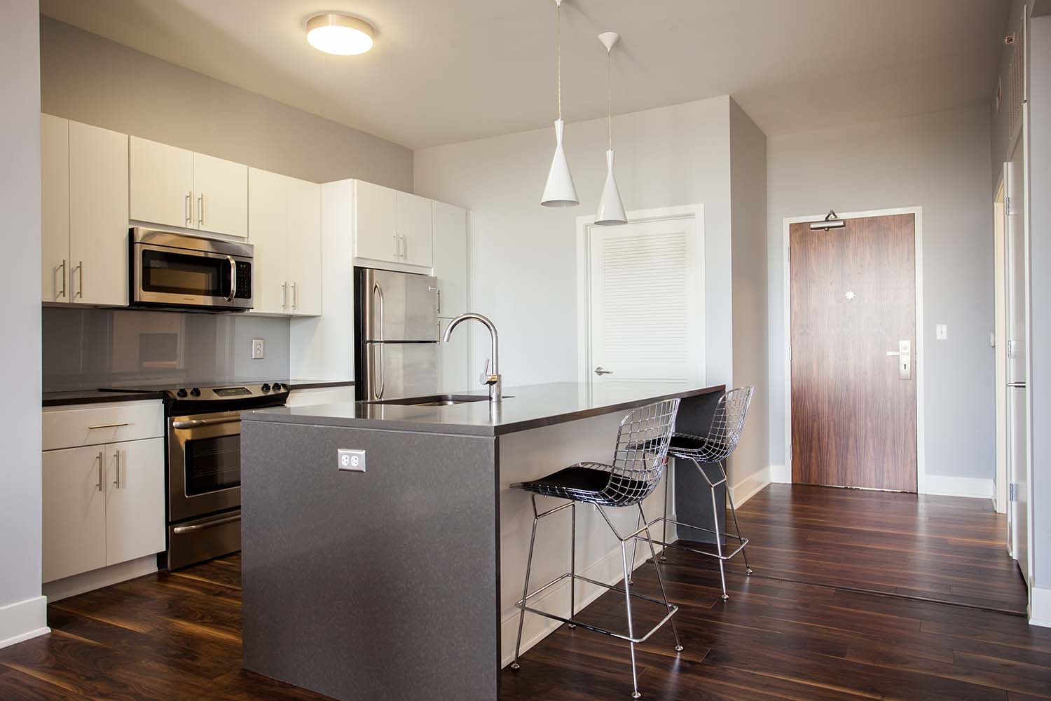 Located at 301 East Armour Boulevard, the International is Hyde Park’s first apartment community with a spacious and mid-century modern luxury style. What was once the old IBM building in 1960 has now been converted into a mixed-use space featuring 56 newly remodeled apartments and retail spaces on the lower levels. These apartments are incredibly spacious and feature waterfall island counters, high ceilings, plank flooring, a washer and dryer in each apartment, and floor-to-ceiling windows that allow for an amazing view of the historic Hyde Park neighborhood. Other properties around the city might have similar features, but few offer the same features with the amount of space relative to the price point. Experience complimentary access to our must-have Neighborhood Amenities, such as lively Resident Events, Gillham Dog Park, and the IBM Lounge. Residents can also customize amenities with our Neighborhood Amenity Memberships to unlock access to the Carriage House Pool and Lounge and the fully equipped fitness center at The Gymnasium at the nearby Bellerive.